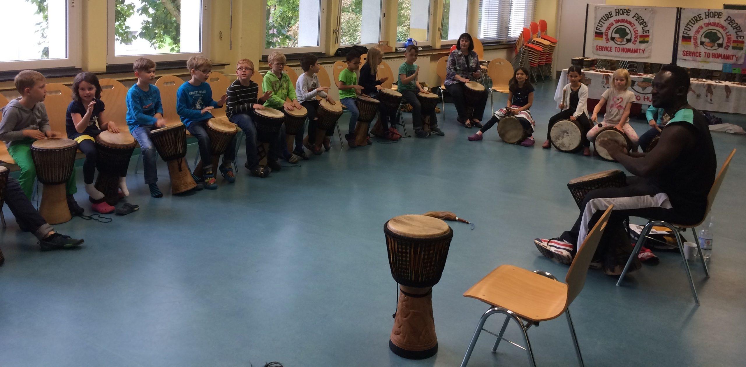 Wir freuen uns regelmäßig auf die Trommel-Workshops mit Djarbah Quarcoo (Sozialarbeiter) zur Unterstützung des Projekts „Future – Hope – People“.