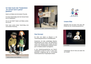 „Eine wichtige Aufgabe der Verkehrssicherheitsarbeit der Verkehrspuppenbühne besteht darin, Kindern und Jugendlichen durch emotionales Erleben für die Gefahren im Straßenverkehr zu sensibilisieren. Sie sollen auf die aktive Teilnahme am Straßenverkehr vorbereitet und somit Verkehrsunfälle unter Beteiligung von Kindern reduziert und schwere Unfallfolgen minimiert werden.